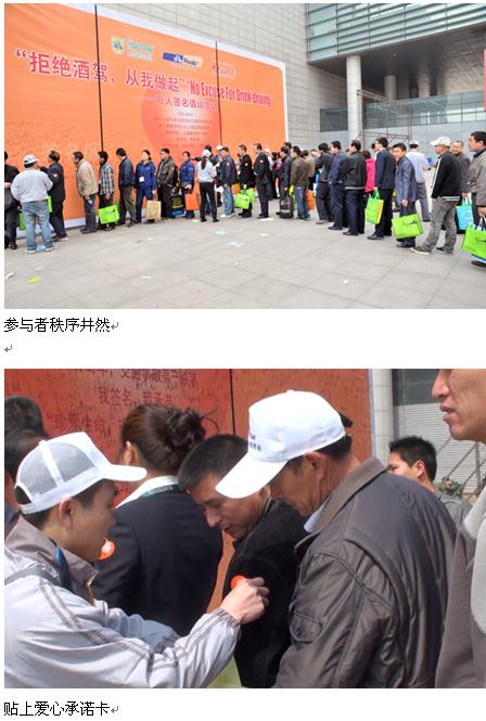 您知道吗? 50%-60%的交通事故与酒后驾驶有关, 死亡事故中50%以上源自酒后驾车。 酒后驾车,交通事故第一杀手! 我签名,我承诺: “珍爱生命,拒绝酒驾,从我做起” 随着“珍爱生命,拒绝酒驾,从我做起”口号在青岛国际会展中心广场一遍一遍的播放,越来越多的参会者踊跃的参与此次公益活动,巨幅的签名板上留下了数千名海内外朋友的名字,更留下了他们郑重的承诺,也证明本次活动取得了圆满成功。 参与者在签名板上郑重的签下自己的名字,许下自己的承诺,然后领取一份爱心卡。工作人员随机采访了几位参与者。来自内蒙的李先生说:“我从来不酒后驾车,酒后驾车太危险,对家人对社会都是不负责任的表现。”青岛的赵小姐表示:“虽然我现在不会开车,但是以后考了驾照,也要特别注意,不酒后驾车。”还有的朋友说,有时候喝点酒可能不太在意,但是看看你们的统计数据,确实应该引以为戒。而更多的群众告诉我们,这次活动很有意义,但是只签字是不行的,既然写下了这份承诺,就要在以后的驾驶旅程中践行自己的承诺,绝不酒后驾车。还有很多小朋友和外国友人热心参加了此次活动。我们为这些参与者的热情和承诺鼓掌,每一个人都从自身做起,珍爱每一个鲜活的生命,远离酒精,谨慎驾驶,我们的生活将充满更多的安全和幸福。