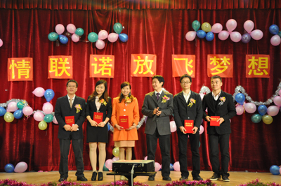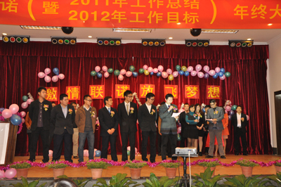 9日下午两点,年会在激情、热烈、活跃的气氛中举行。首先由董事长致开幕词,接着一场喜庆的《好运来》舞蹈正式拉开年会的序幕。年会分为上下两半场,上半场由员工做2011年工作总结及2012年工作计划发言,销售各部及内务各部分别对2011年工作做了总结,肯定了过去一年所取得的成绩,并对工作中不足之处作出归纳、提出改进计划,同时对来年的工作作出展望,大家携手奋进充满挑战的新一年。年会中,销售部组织了2012年销售业绩PK,由销售精英选择2012年业绩PK对象,各销售部之间进行竞争,约定奖惩机制,使得销售部员工们激情澎湃、斗志昂扬,对2012年的销售工作充满了信心与希望,将此次年会推向高潮。随后公司领导公布了2011年度优秀团队奖、领头羊最佳进步奖、工作能手奖及销售猎鹰奖等奖项并颁奖,充分肯定了公司员工在2011年取得的优秀业绩,并希望在今后的工作中取得更大的进步与成功。年会下半场,联诺员工表演了时装秀及歌曲等节目,充分展示了员工的新风貌及个人特长,在欢快活跃的气氛中增强了员工之间的团队合作精神,将年会又一次推向了高潮。随后抽取了本次年会的一等奖、二等奖、三等奖及幸运奖等奖项,公司员工均有获奖,大家笑逐颜开、满载而归。公司总经理林亨耀为员工舞蹈并演唱了一首《莫斯科郊外的晚上》,台下掌声热烈,将此次年会再一次推向了高潮。最后,年会在主持人《新年如意》的歌声中,和谐、温馨地圆满结束。