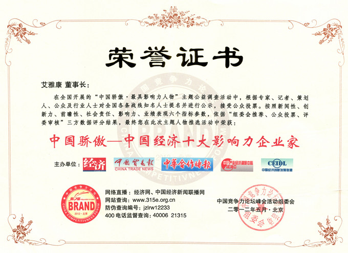 由中国产业经济调研中心、中国经济创新发展联盟、中国《经济》杂志社等单位在全国开展的“中国骄傲•最具影响力人物”主题公益调查活动于2012年5月27日在北京人民大会堂揭晓,四川力达士石油化工有限公司董事长艾雅康荣获“中国骄傲—中国经济十大影响力企业家”称号。