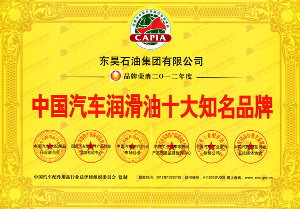 2012年10月27日,在业内誉有汽车行业的“奥斯卡”之称的第七届中国汽车配件用品行业总评榜评选活动在南京博览中心隆重举办,中国汽车汽配用品行业联合会秘书长田芳、中国质量监督检测中心主任闵新和等业内知名嘉宾纷纷出席了会议。在此次活动中,东昊石油集团有限公司凭借雄厚的综合实力及产品服务优势,在众多润滑油品牌中脱颖而出,被组委会正式授予了2012年度“中国汽车润滑油十大知名品牌”荣誉称号。