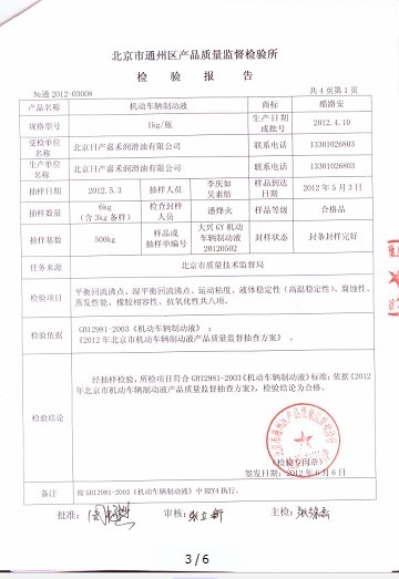 近日,北京市技术监督局抽查的制动液表明,北京日产嘉禾润滑油有限公司生产的酷路安DOT4机动车制动液达到HZY6标准要求。HZY6是新的机动车制动液国家标准的一个型号,对应国际标准ISO4925GLASS6。HZY6标准对平衡回流沸点的要求是不低于250C°,虽然低于HZY5的要求,但是-40C°运动粘度要求是低于750CST,要优于HZY5标准要求的不低于900CST。通2012-03008检验报告表明,酷路安DOT4制动液的平衡回流沸点为257C°,湿平衡回流沸点为176.5C°,-40C°运动粘度为756.8C°,性能达到HZY6的要求。北京日产嘉禾润滑油有限公司孙全和告诉记者:“产品的性能的之所以这么高,完全是为了满足赛车的苛刻要求,用于赛车的产品用在普通车辆上更可提高车辆的安全系数。不只是制动液,就是日产嘉禾润滑油公司生产MIZUHO 途顺达SG汽油机油,其超低的摩擦系数也是许多品牌的SN级别的机油不可比的。许多品牌SN10W40的摩擦系数是(SRV摩擦实验)0.132,而途顺达SG的摩擦系数只有0.065,低两倍还要多。低摩擦的效果就是增加了发动机的动力输出,这对于赛车尤其重要。”
