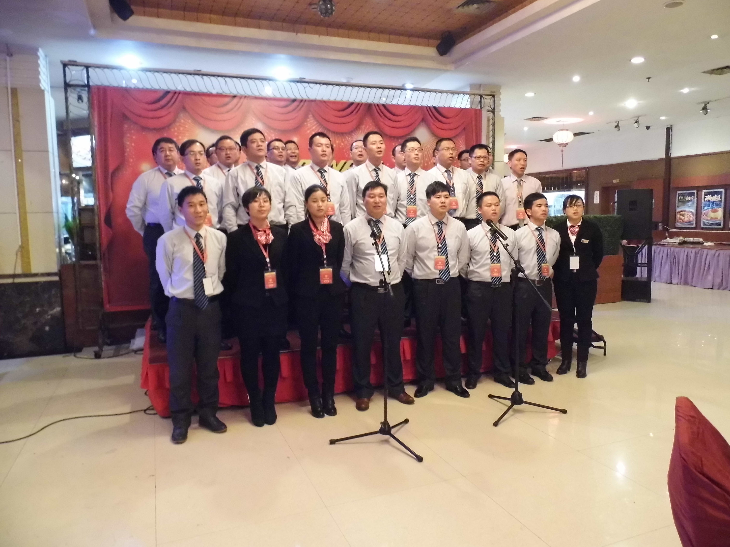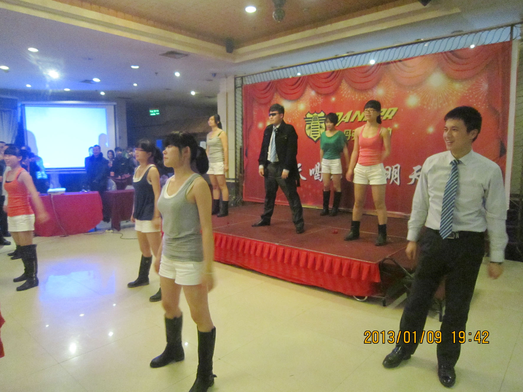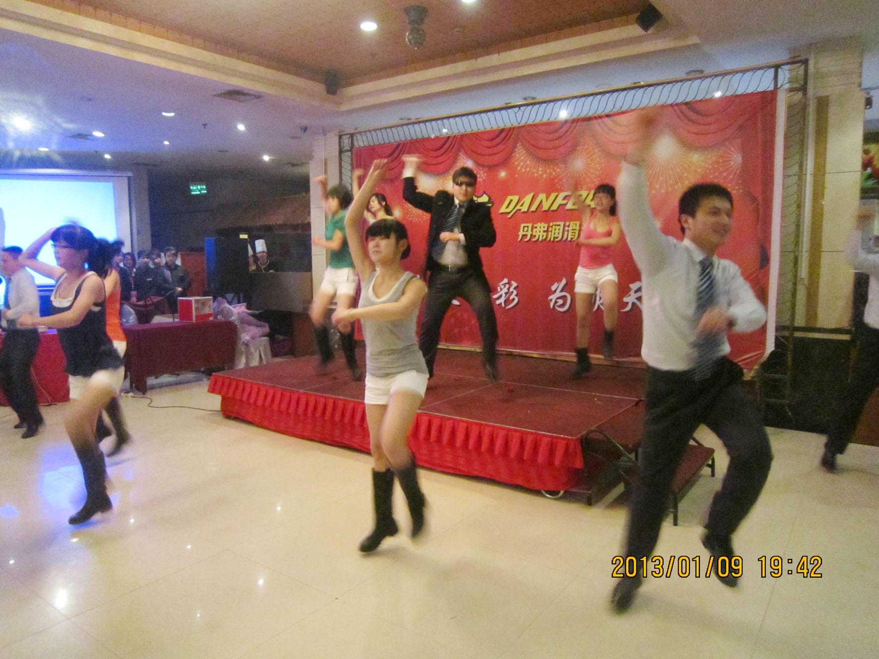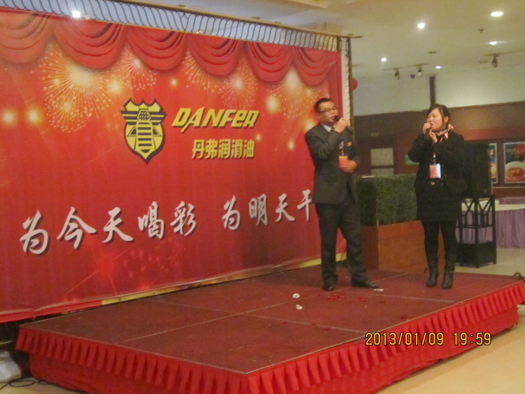 (车间参观) 组织文艺晚会 1月9日晚上6时,永康紫薇花园宾馆一楼餐厅,宾朋满座,歌声飞扬。以“为今天喝彩,为明天干杯”为主题的丹弗文艺晚会,在市场部全体营销人员的大合唱《步步高》中拉开序幕。雄壮激越的歌声,表达了丹弗人“付出总有回报”的决心和“要做就做最好”的信心,以及在新的一年步步登高的美好愿望。 紧接着,是客户部和财务部陈洁琅、徐静、朱璐、蓝佳表演的浙江民间舞蹈《采茶舞》,婀娜的舞姿,动人的旋律,让观众放下酒杯欣赏、喝彩,一饱眼福,台下响起阵阵掌声。市场部周威、苏梦飞表演的相声《新闻晚知道》,令人忍俊不禁,硬是让他们过了一把当新闻播音员的瘾。在热烈的气氛中,许多经销商和营销人员登台亮相,演唱了一首经典歌曲。总经理王安文也禁不住内心的激动,献上一曲曾经流行动听的《新鸳鸯蝴蝶梦》、营销中心王伟总监也上台高歌一曲,全场掌声、喝彩声不停响起。陈洁琅、曾中英、吕霞、罗瑞峰、刘和祥等10人表演的韩国神曲《江南Style》,更是火爆、疯狂,将晚会推向高潮…… 三句半、独唱、歌舞、诗歌朗诵,一个个员工自编自演自导的精彩节目,赢得了雷鸣般的掌声。节目之间,同时还安排了五个级别的抽奖活动,更增添了晚会的热闹、欢乐气氛,让经销商和员工共同度过了一个难忘的夜晚。