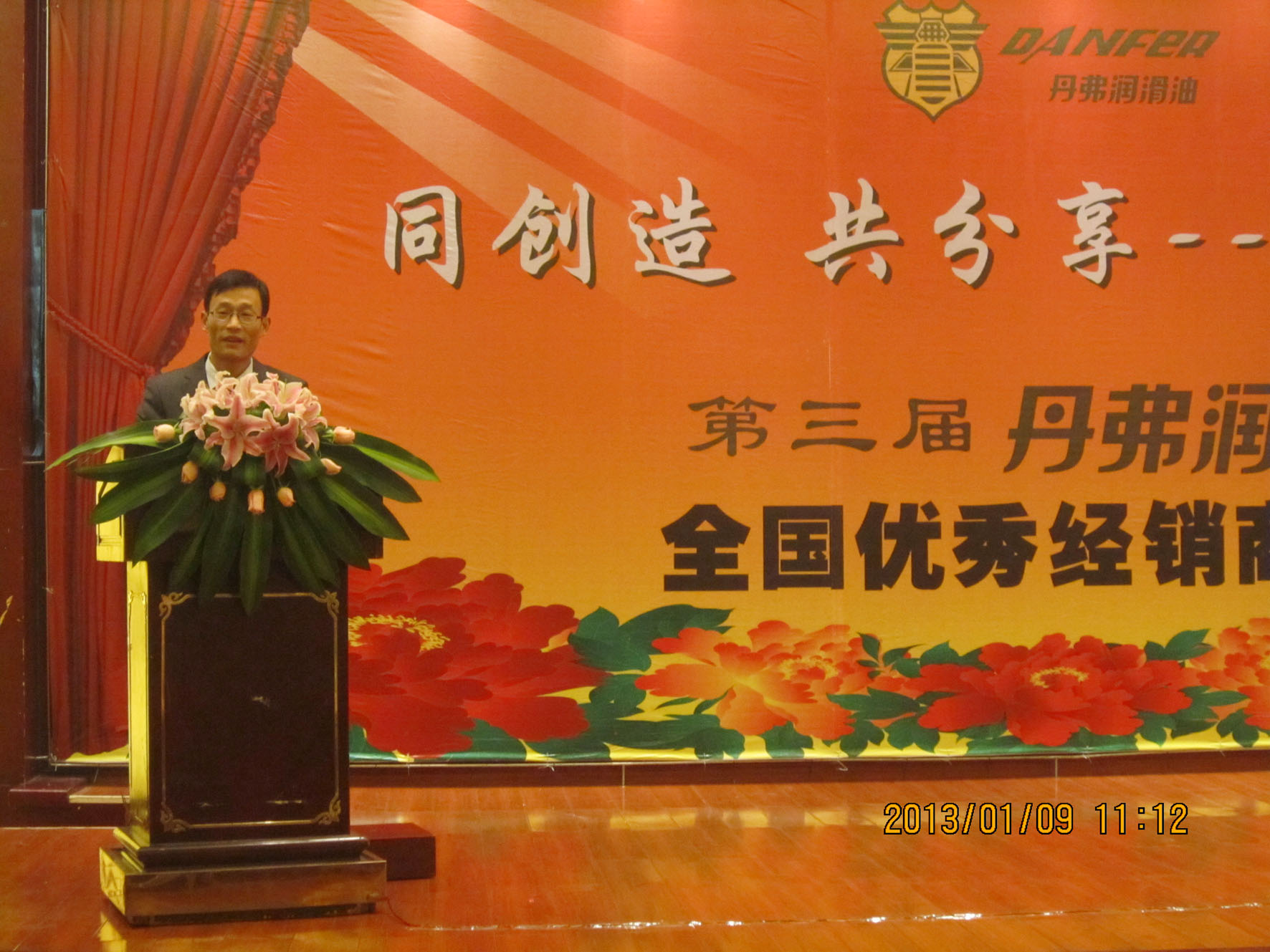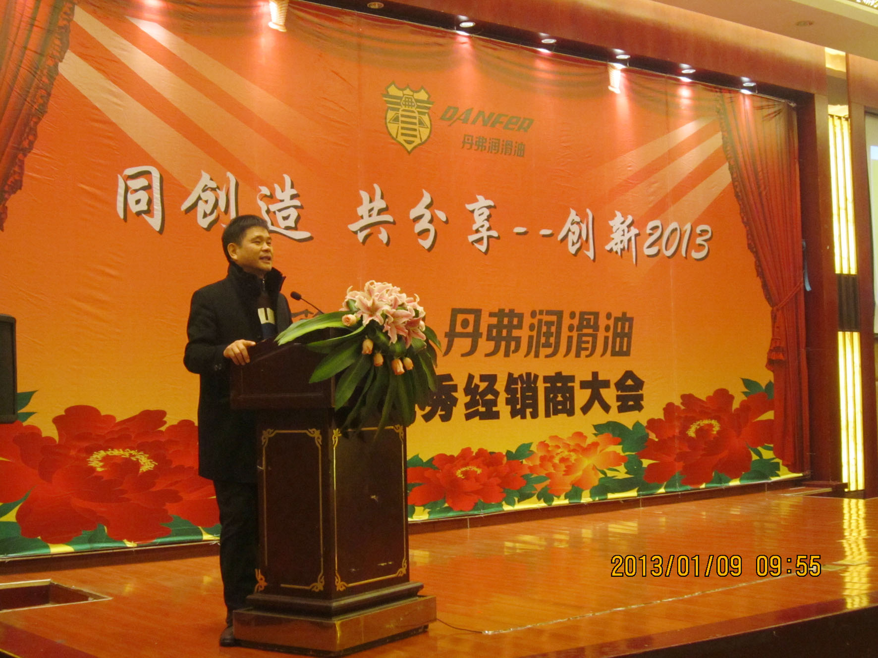 (集团董事长王跃斌发表演讲) 营销总监王伟对2012年的销售业绩和2013年的营销规划进行了通报,并通报了营销中心新变化,并就2013年的市场走向及政策等做了预说明。会末王伟总监带领南、北市场部孔歆、宋永丰经理及四个大区经理亮相主席台,向支持丹弗事业的经销商鞠躬表示谢意。