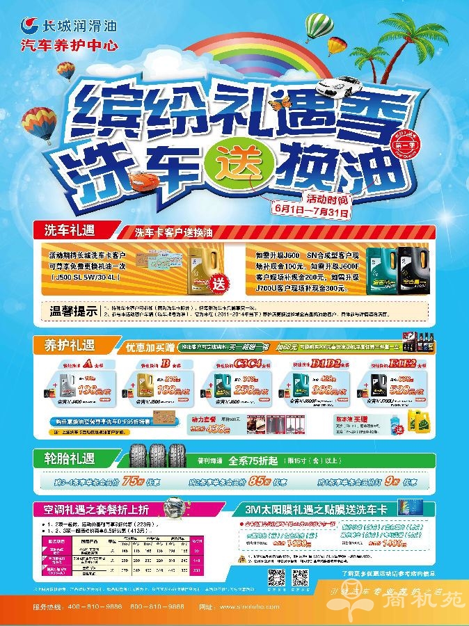 长城润滑油汽车养护中心开展“缤纷礼遇季洗车送换油”大型营销活动即将于7月底收官,还没有享受到的车友要抓紧了。 活动会针对在养护中心办理洗车卡的客户开展免费换油惊爆体验活动,只要符合活动要求就可以享受原价218元的(J500 SL 5W/30 4L 换油B套餐)免费换油体验一次,优惠史无前例,且行且珍惜! 此外还针对天气特点推出了贴膜赠洗车卡、空调清洗99元,空调系统养护折上折、换机油套餐特惠礼赠和普利司通轮胎(15寸以上)全系7.5折起等活动,让您在酷热天气尽享怡人清凉。