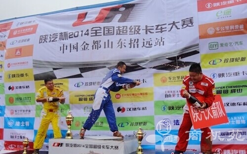 7月21日-25日,“陕汽杯2014全国超级卡车越野大赛中国金都山东招远站”比赛激烈角逐,25日下午在台风雨水的洗礼中结束。6支车队经过16轮厮杀,最终获得前三名的车队分别是:第一名,零公里润滑油队;第二名,固铂成山轮胎车队;第三名,玲珑轮胎队。个人前三名分别是:玲珑轮胎队魏好、陕汽火箭队杨平、固铂成山轮胎队姜虎。