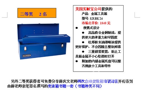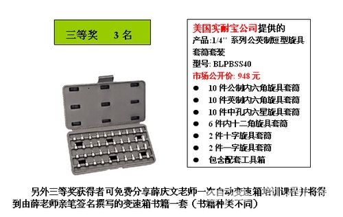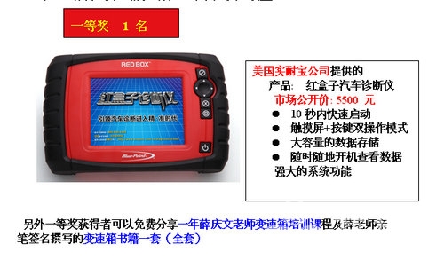 报名参赛的选手可以提交1篇原创技术类文章,也可以将自己在维修过程中总结的巧招、妙用或者心得总结成文章,字数不限,提交到www.qcwxzj.com-陆兵自动变速箱赛区-零公里赛场,然后在网上填写完整的报名表,或者将联络方式及相关资料交给零公里石化的工作人员统一报名均可,凡参与中国汽车诊断师大赛官方网站报名:陆兵自动变速箱赛区-零公里赛场的选手,均可获得由薛庆文老师亲笔签名的《换油宝典》一套!更多奖品等你来拿!