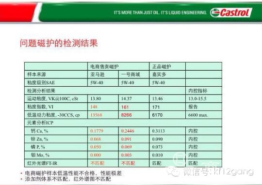 自之前美孚官方曝光京东出售仿冒美孚1号机油后,嘉实多磁护也在电商平台上出现了假货! 据云南嘉实多润滑油经销商网站消息,近期,CCTC(嘉实多中国技术中心)对亚马逊和1号店等电商上销售的嘉实多磁护产品油样进行测试,测试结果很震惊,如下: