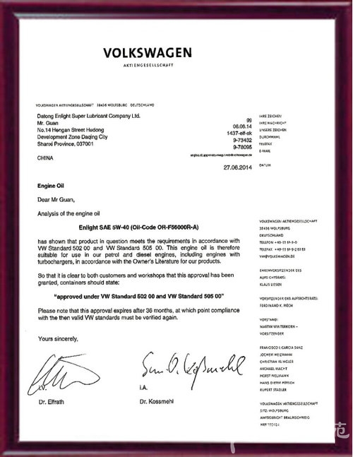 继英莱壳润滑油通过美国康明斯认证和德国梅赛德斯奔驰认证之后,近日又通过了德国大众认证。大众汽车总部位于德国沃尔夫斯堡,是世界四大汽车生产商之一的大众集团的核心企业,其发动机的缸内直喷技术使雾化喷入的燃油与进气得到精确、充分、均匀的混合,并充满整个气缸,全工况实现均质燃烧,燃油充分燃烧,也就充分发挥了每一滴燃油所储存的能量,使发动机产生高动力输出,同时,燃油消耗也保持在较低水平。 本次通过大众认证的油品是英莱壳全系列SAE 5W-40发动机油,大众公司经严格的检测分析,确定英莱壳SAE 5W-40发动机油各项性能指数均达到了大众50200和大众50500规格标准要求,这款油适合使用在大众的汽、柴油发动机及带涡轮增压的发动机中,而且符合大众产品的相关用户手册。大众的50200是汽油机油规格、50500是柴油机油规格,但在实际使用当中,大众汽车要求一种机油要同时满足这两个规格,这对机油的质量提出了苛刻的要求,而来自英莱壳ET研发中心的油品,经反复调和试验得出的油品参数是适应发动机的最佳指标,Enlight SAE 5W-40机油促使大众发动机发挥更加优秀。