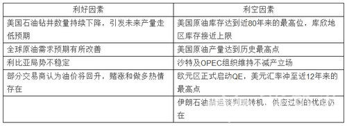 ![]() 当我们想知道油价后市是会上行还是下跌时,首先要关注市场上的利好及利空因素。当利空因素显著压倒利好的时候,油价便会出现持续下跌的走势,比如2014年的6-12月;当利好因素显著压倒利空的时候,油价便会出现持续上行的走势,比如2013年的7-9月;而当利好和利空双方均无压倒性优势的时候,油价便会区间内震荡趋稳,比如当下这个时期(2015年2月-3月上旬)。目前市场上的利好及利空因素如下所示:
