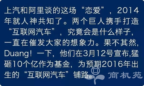 当下,在汽车圈里,最火热的话题莫过于两会中关于汽车行业未来如何发展,而工业和信息化部部长苗圩对互联网汽车等方面的鼓励则让更多的人眼前一亮,“它们有为汽车行业创造新生产模式的潜力”。 ![]() 时隔半年之久,上汽集团和阿里巴巴在互联网汽车方面终于有了新的举动。3月12日,上汽集团和阿里巴巴共同宣布,将合资设立10亿元的“互联网汽车基金”。