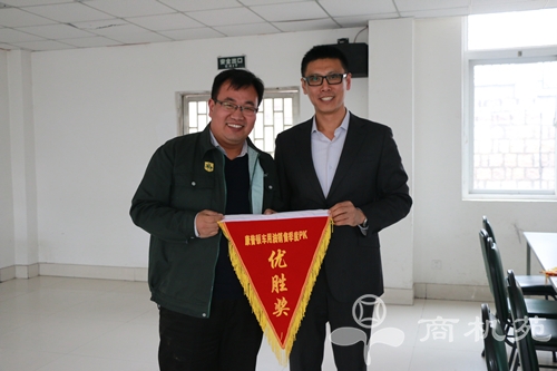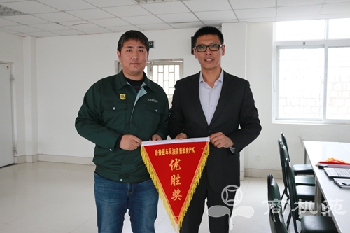 ![]() 车用油华南大区经理李宏伟(左)代表团队获优胜奖锦旗