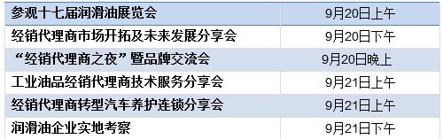 v 参观十七届润滑油展览会(9月20日 上午) 中国国际润滑油品及应用技术展览会是中国润滑油行业一年一度的最大盛会,今年展会步入了第十六个年头。作为被公认为中国乃至全球润滑油行业规模最大、国际性最高、专业型最强的第一品牌展会,今年包括中石化 、中石油、埃克森美孚化工、意大利埃尼ENI、日本引能仕、中节能环保(南京)有限公司、汉地阳光、美国彼凌驰、美国CAM2、珠海美合、金雪驰、加美、美国API 、山东红星、山东环球、山东长鸣、上海纳克、上海希戈、东联汽车集团、武汉玻尔、三和润滑油、中部石油、优宝惠等近200家优质企业积极参与!这里是您了解整个润滑油行业发展现状与最新趋势的不二之选,让您最直观,最近距离的,最客观的把握行业动向,搜集行业信息。 ![]() v 经销代理商市场开拓及未来发展分享会(9月20日 下午,展馆会议室) 精英团行动是经销商们学习经验、探讨困惑、结交朋友的绝佳机会。今年主办方将邀请来自各地的成功经销代理商以及资深营销专家就如何开拓市场、打造经销团队,创造渠道价值等经销代理商最为关注的话题分享各自宝贵的经验。 ![]() v “经销代理商之夜”暨品牌交流会(9月20日 晚上,好彩又一鲜大酒店) 为感谢广大经销代理商对精英团行动的参与,主办方将特别安排招待晚宴,为大家提供一个轻松和谐的交流场合。届时,主办方还将精心挑选了有实力有特色的润滑油品牌企业代表精彩亮相,为在场的经销代理商了解品牌选择商机提供对接互动的契机。 ![]() v 工业油品经销代理商技术服务分享会(9月21日 上午,展馆会议室) 特邀工业润滑油品的资深经销代理商与您进行精彩的面对面分享,工业润滑油品的销售与技术服务实战经验,教您如何从粗放走向精细化管理。如何用产品加专业服务的模式在渠道越来越扁平化的行业大环境下,突破价值瓶颈,赢在未来。 v 经销代理商转型汽车养护连锁分享会(9月21日 上午, 展馆会议室) 汽车后市场的巨大潜力正在被飞速挖掘,大量服务于洗车、保养、信息查询,以及二手车买卖等领域的APP产品推陈出新。市场人士指出,随着汽车市场逐渐成熟、汽车产业链越来越长。经销代理商如何转型进入汽车养护连锁,进入到中国汽车后市场新一轮的淘金热浪中。 ![]()