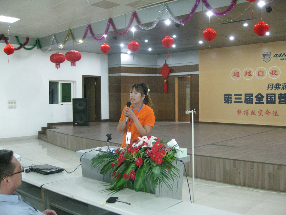 来自兰州的丹弗优秀经销商安青在会上发言,讲述了自己市场操作管理经验。安青说:想成功就要选择一个有长远目标的优秀企业合作,只有这样,经销商才有立身之本,而对下级客户的选择也是如此,下级客户如果没有梦想,将难以有共同的目标。在代理丹弗润滑油的六年中,从润滑油门外汉到今天一年上千万的销售额,除了自己的努力,更多的还是客户的支持,公司不仅仅是把货卖给下级客户,还帮助他们顺利销售,这几年来,除了丹弗润滑油公司提供的宣传物料外,自己还制作了大量的工装、太阳伞、帐篷、单页、客户卡等等,有效的提升了品牌形象,提高了市场销量。安青勉励大家:作为一个门外汉的她,都能做到今天的规模,在座的朋友也一定能够能做的更好。
