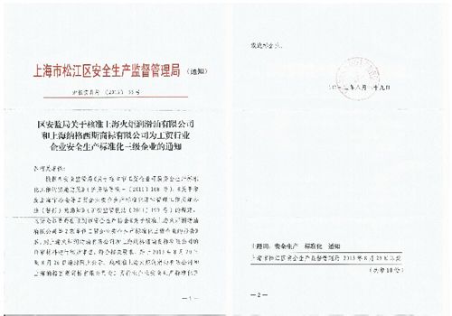 2013年9月2日上海火炬润滑油收到了松江区安全生产监督局发来 “关于区安监局核准上海火炬润滑油有限为工贸行业企业安全生产标准化三级企业的通知”。